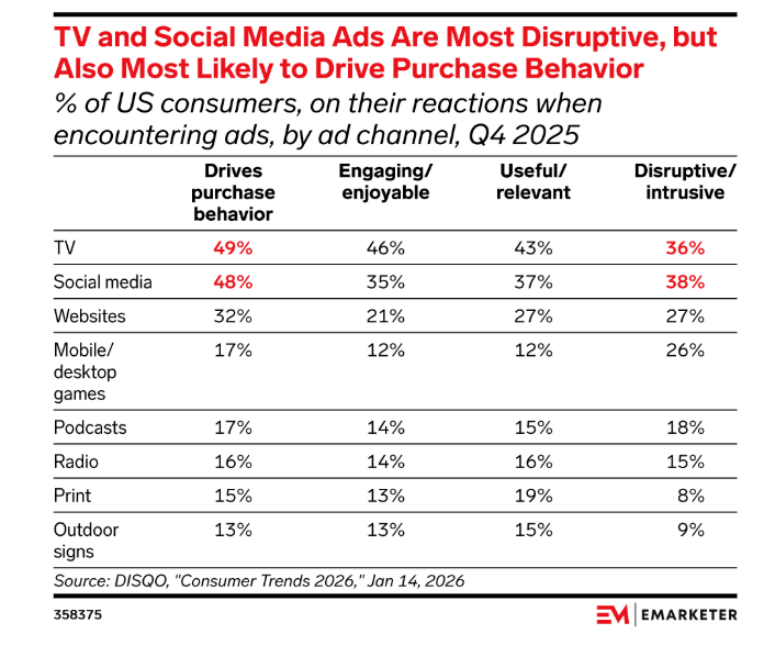 Dados do 4º trimestre de 2025 mostram que redes sociais (48%) estão praticamente no mesmo nível da TV (49%) quando o assunto é impulsionar comportamento de compra nos EUA.
